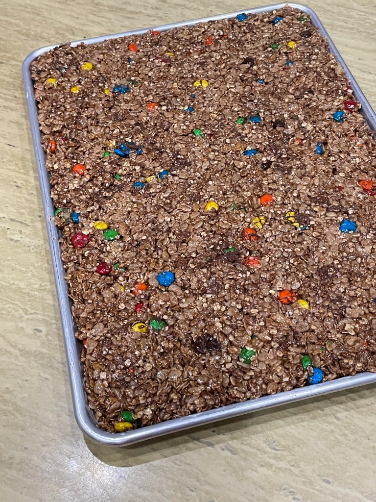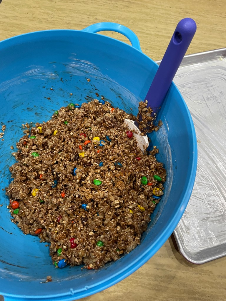 Mix all together and press into the greased cookie sheet (about 12″ x 17″ size). I use a rolling pin to compact them together good! Cut into whatever size bars you desire and then cool just at room temperature.
