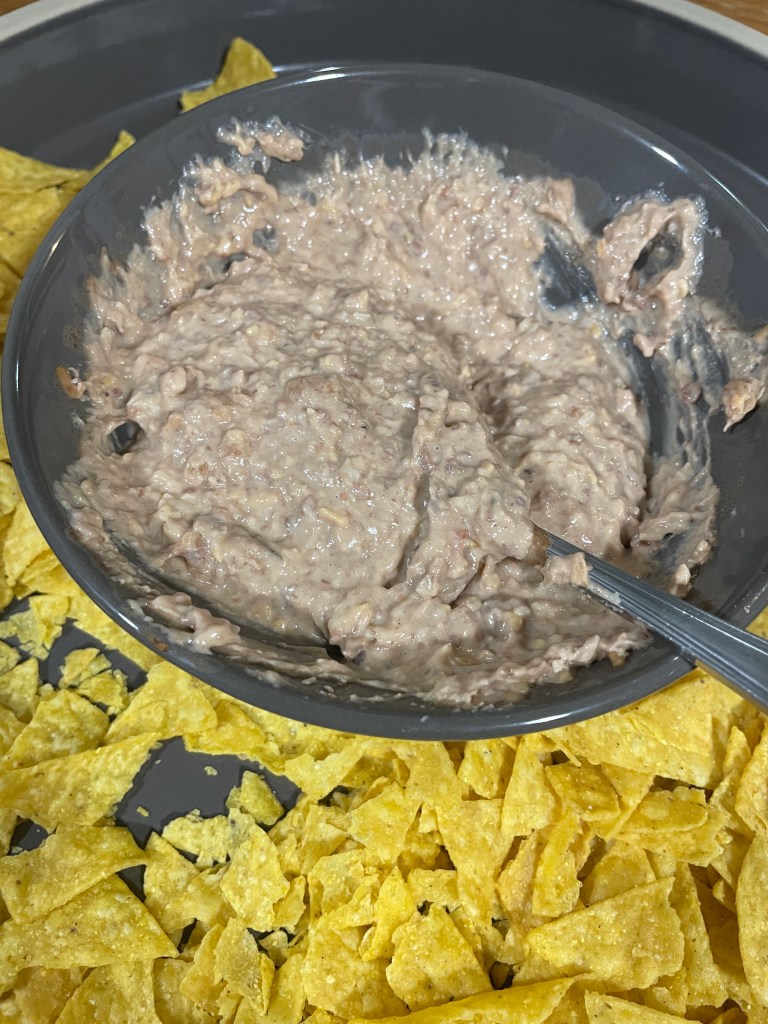 When beans are very hot, use a hand mixer to mash them up. Add the bowl of ingredients and mix again. After it is well mixed, add 3 – 6 cups shredded cheese and mix again. ~~~~~~~ I sometimes use fine shredded cheese and it takes less. If it is thick shredded cheese, you will want to use a bit more. And some people like it super cheesy while others like it less cheesy. You will have to decide. But for sure you will want the 3 cups.