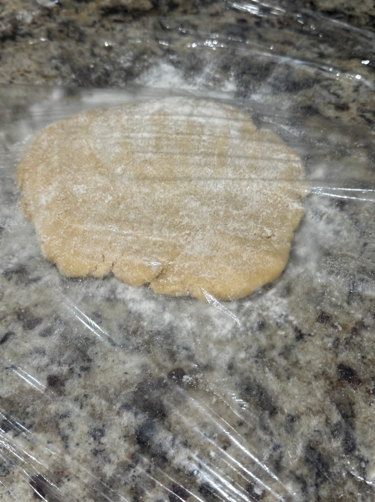 After dividing my dough into 3 (or 4) equal parts, I wipe my countertop with a damp cloth. I then put an 18″ wide piece of plastic wrap that is about 2 feet long on the damp countertop, stretching it and smoothing it out so it clings.