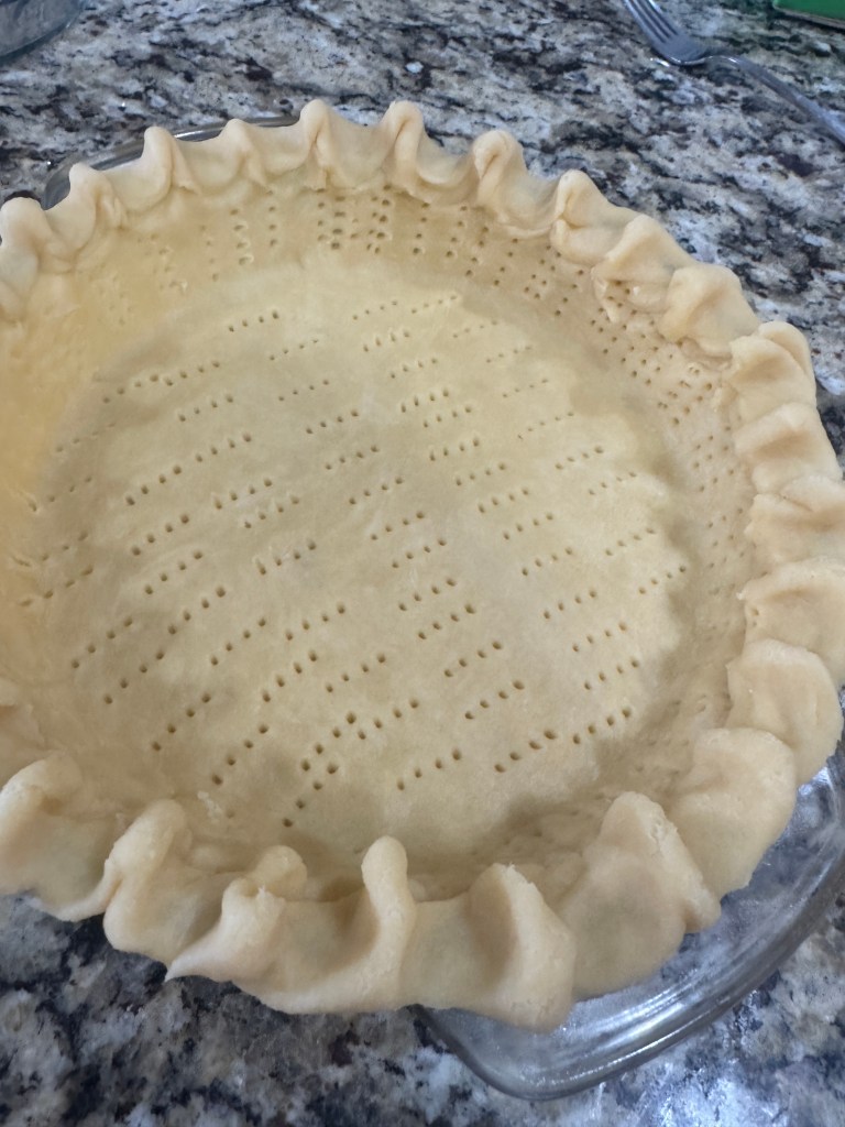 Press crust into pan and roll/crimp edges. Next, poke holes all over the bottom and sides of the crust with a fork.