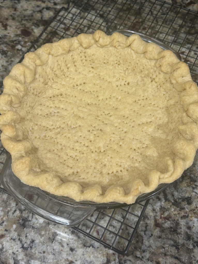 Place into a 375° preheated oven. Bake for 9 minutes. Poke holes in the bottom of the pie crust again ~ maybe 15-20. Close the oven door and bake for another 8 minutes. Remove from oven and cool on a cooling rack. Use as desired!